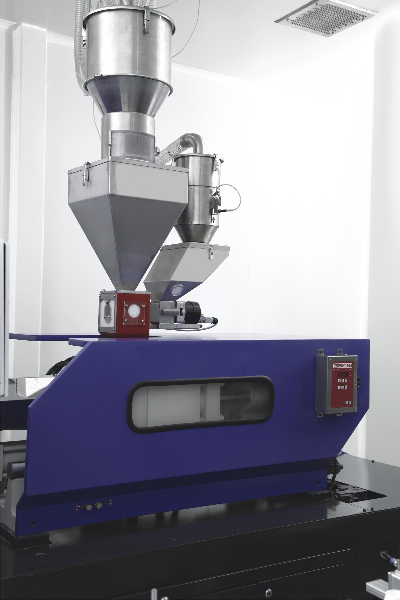 A state of the art central conveying system takes care of the resin and colorant dispensing up to the machines ensuring the elimination of human contact after the primary debagging stage .